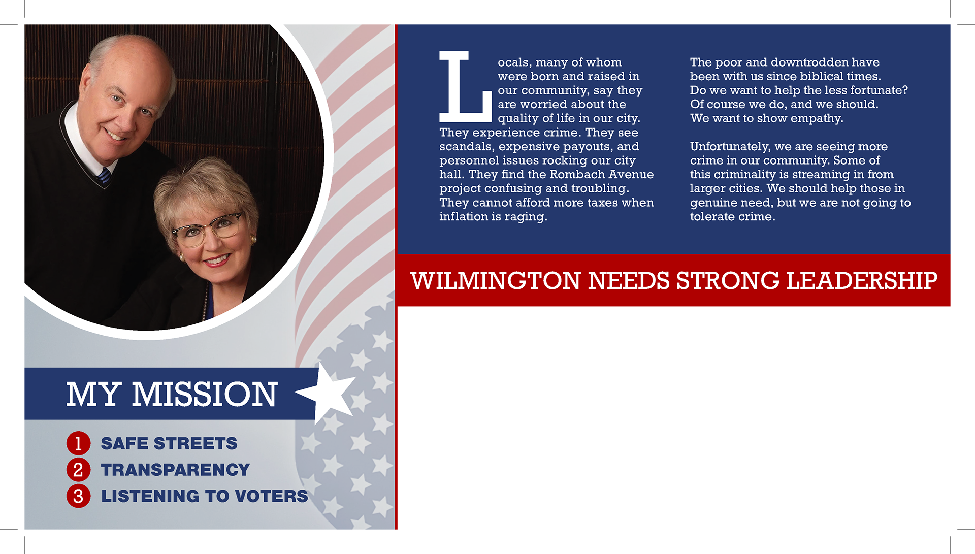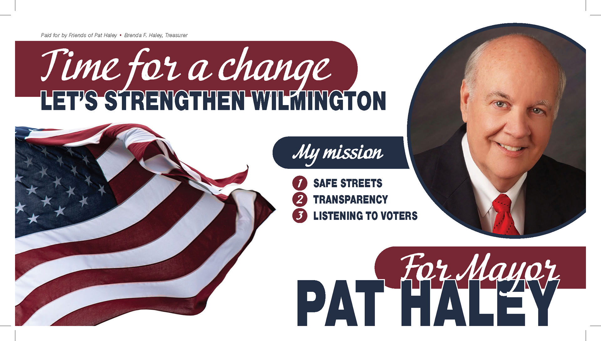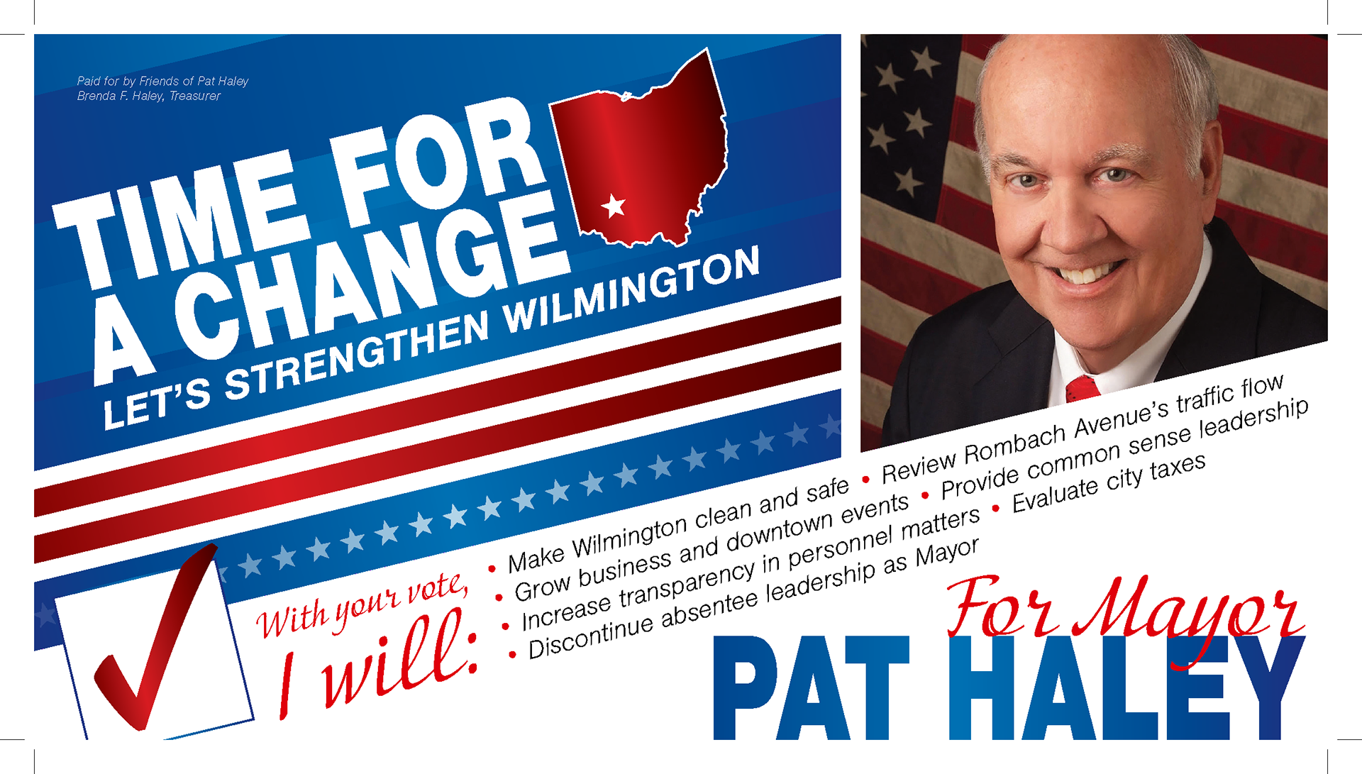 On New Year's Eve 2022, I ran into a family friend named Pat Haley while celebrating the holiday in my hometown of Wilmington, Ohio. That evening he informed me of his intent to run for mayor in the upcoming primary election, and he expressed a need for spreading the word. After discussing his campaign timeline, I happily agreed to design the mailers for his candidacy. The graphics below are the results of that effort.