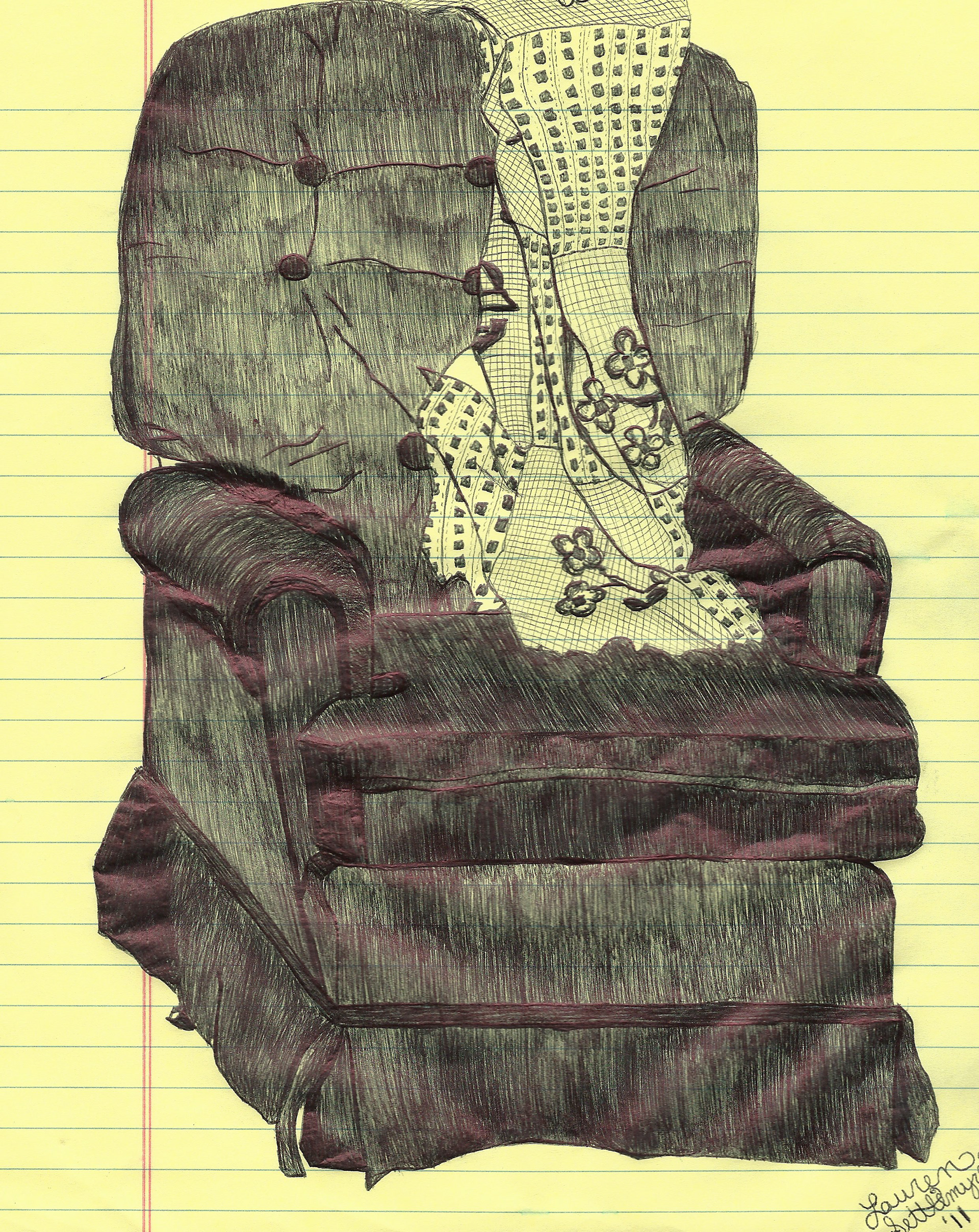 What do you do on a gloomy winter day when you're stuck inside? I like to draw old rocking chairs that used to belong to my great-grandmother (or at least I did when I was 15). Staring at this piece of furniture for several hours, I found it to be a serene experience. If you're looking to emulate the same state of tranquility, I highly recommend finding an inanimate object in your home or elsewhere, grabbing some paper and a drawing utensil, and letting your creativity run wild. Medium: ballpoint pen 8.5x11.75 in